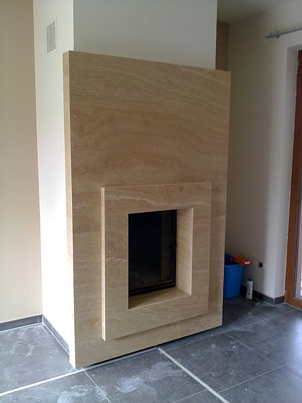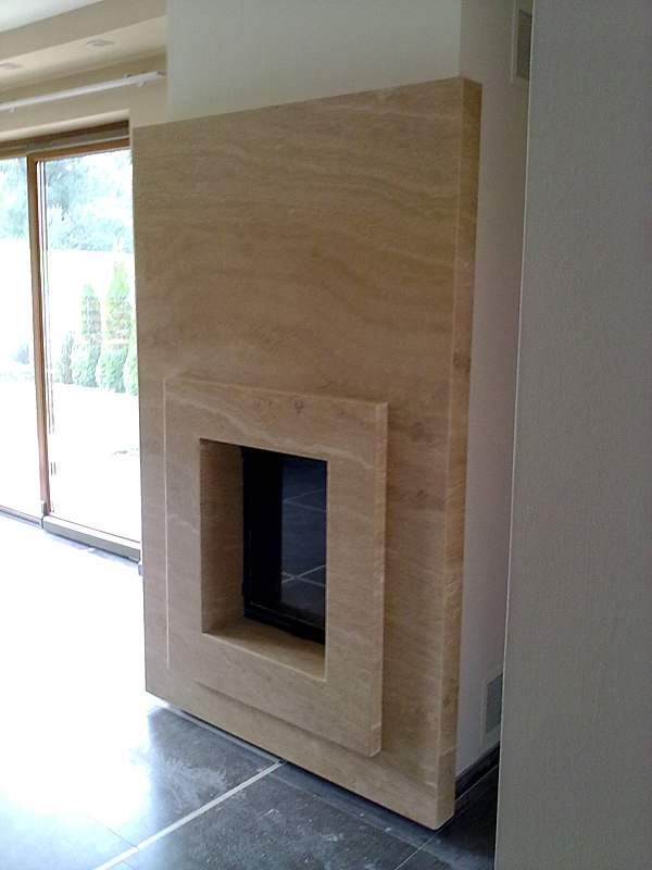 Magasfényű polírozott travertin könnyedén keretezi a tüzet