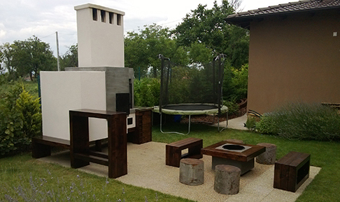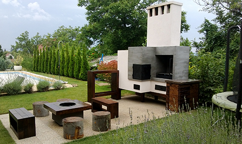 A modern formák a hagyományos gerendavázas kemence típusokból továbbgondolva Kemence-grillező-bográcsozó és külön egy kis szalonnázó tűzrakó