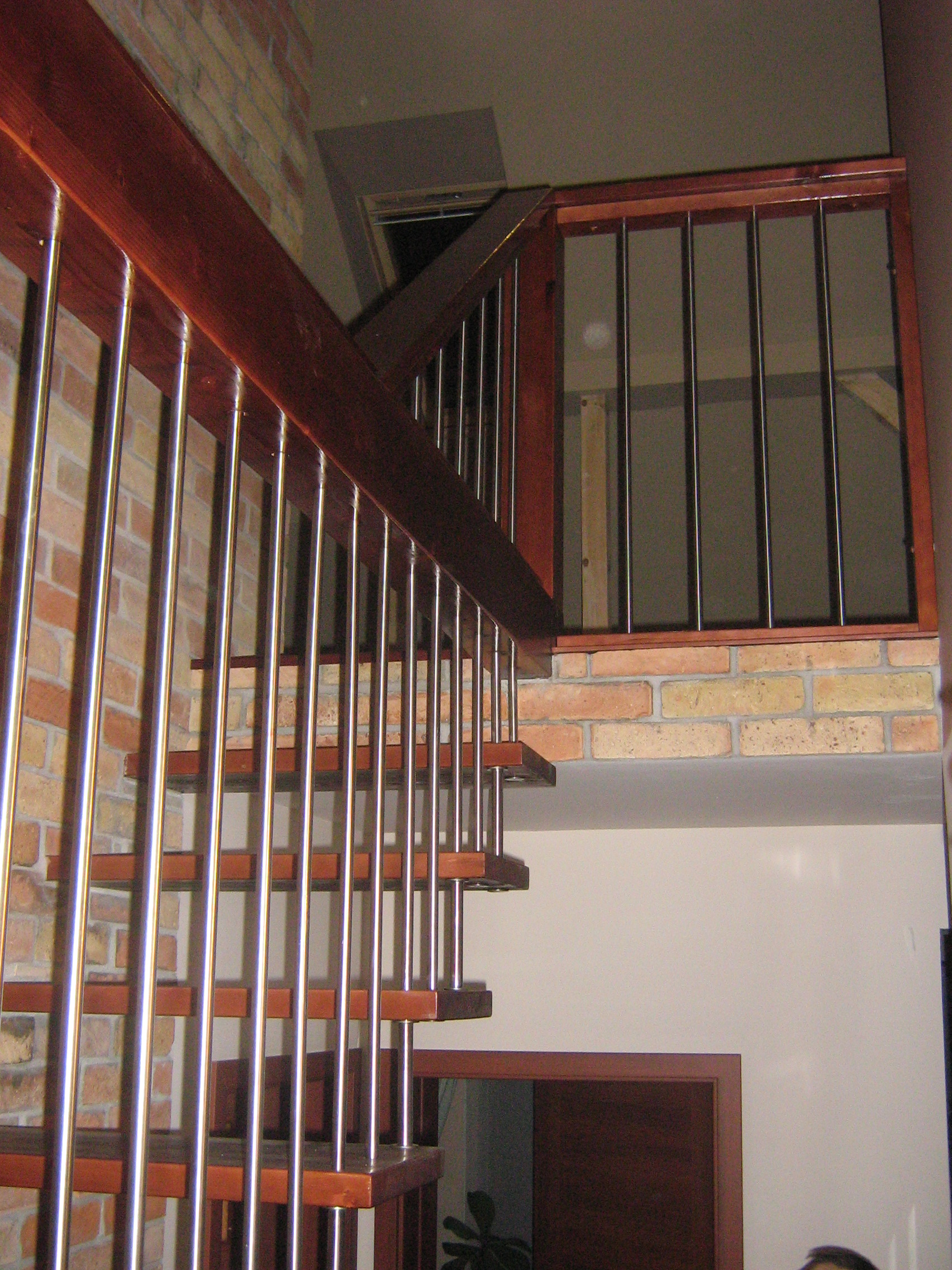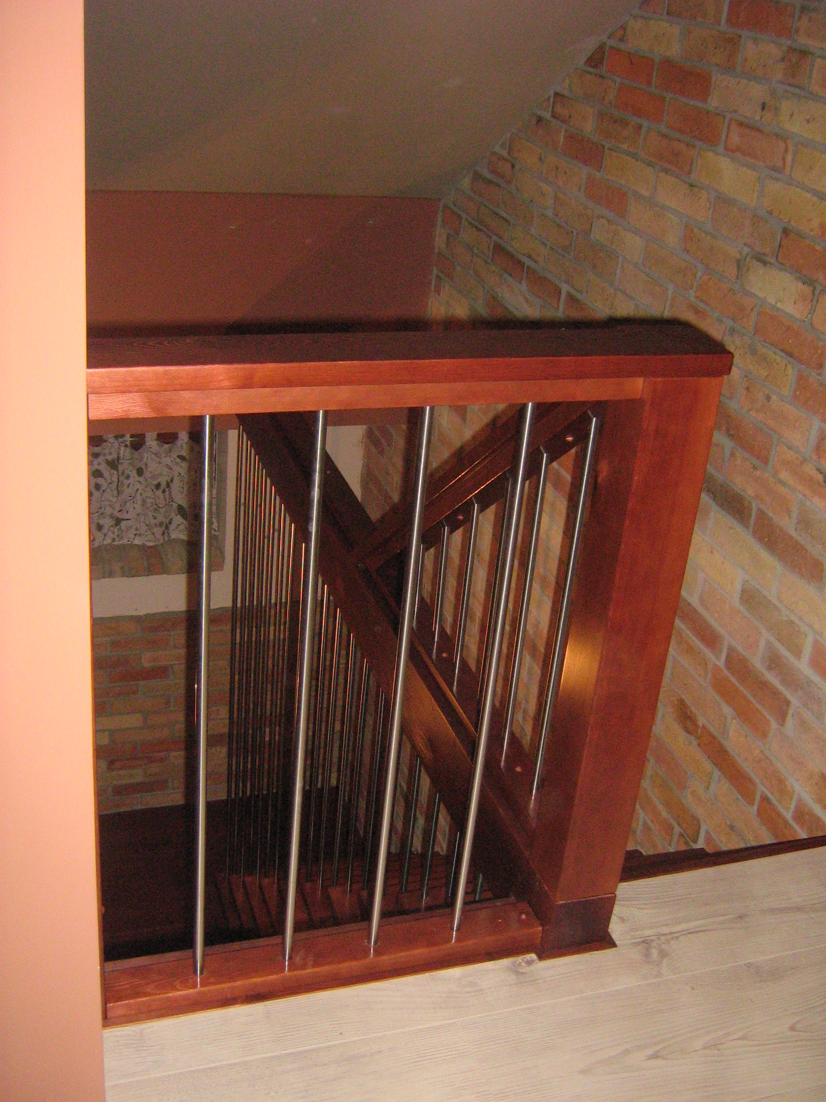 Falba süllysztett acél tartók, függesztő gerenda, szálcsiszolt koracél huzalok, tégla falburkolat Szóval elég komplex munka, asztalos-lakatos-kőműves feladatok összehangolásával